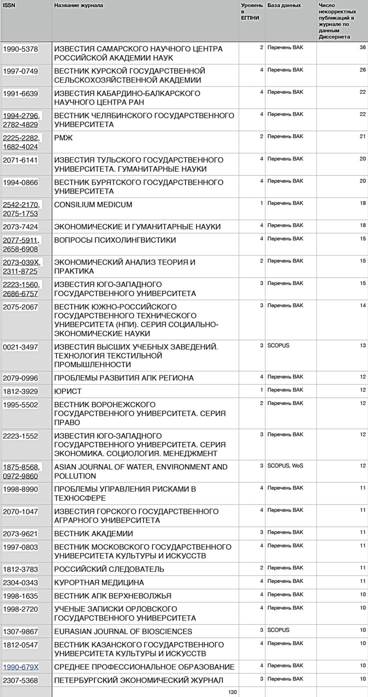 Для того чтобы разобраться в вопросе качества журналов, попавших в Перечень ЕГПНИ, мы воспользовались данными Диссернет. В базе данных сообщества в настоящий момент содержится 1463 наименования журналов, в которых были обнаружены нарушения публикационной этики. Из них мы отобрали только журналы с самыми грубыми нарушениями, и, кроме того, с десятью и более некорректными публикациями в каждом из журналов. К некорректным публикациям Диссернет, в соответствии со сложившейся мировой практикой, относит публикации с плагиатом, фиктивным авторством и дублирующие статьи. В итоге получилось 130 журналов-нарушителей, 31 из которых, как оказалось, вошли в новый Перечень ЕГПНИ. Список таких журналов приведен в таблице и ранжирован по убыванию числа некорректных публикаций. Рассмотрим эти журналы подробнее.