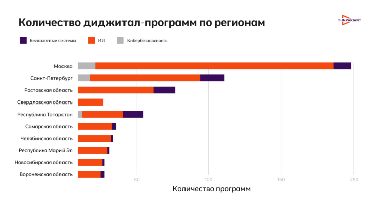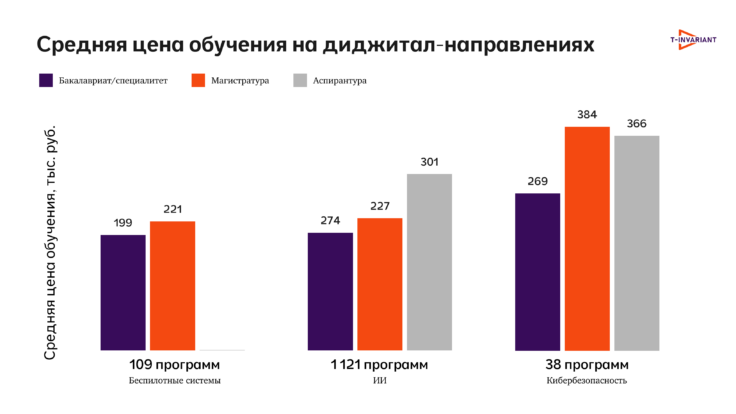 Можно проследить и представленность актуальных сейчас направлений — ИИ и БПЛА. Образовательный рынок адаптировался к интересу аудитории к теме искусственного интеллекта: согласно базе Госуслуг, в России есть как минимум 1121 образовательная программа по тематике ИИ с платными местами. Так, МГУ, например, в 2025 году объявил о создании целого факультета ИИ (правда, абитуриентов в него начнут набирать с 2026 года). Мест, где можно выучиться на специалиста по беспилотникам на коммерческой основе, примерно в десять раз меньше (T-invariant обнаружил 109 таких программ). По обоим направлениям средняя цена бакалавриата — около 200 000 рублей, а магистратуры — около 220 000 рублей. Интересно, что Ростовская область занимает третье место (после Москвы и Санкт-Петербурга) по количеству образовательных программ, посвященных различным беспилотным системам (прежде всего БПЛА), — видимо, сказывается близость к зоне военных действий.