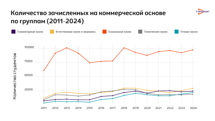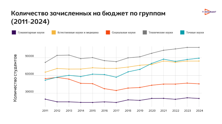 Именно социально-экономические направления многие годы находятся в зоне высокого интереса абитуриентов в целом, а также абитуриентов наиболее «высокобалльных». Это также подтверждается результатами аналитики от компании RAEX (индекс лучших школ России по конкурентоспособности — представлены результаты 300 школ, в том числе видно, куда и как поступали выпускники). При этом количество бюджетных мест на программы по социальным наукам уменьшается — согласно данным «Мониторинга качества приема на бюджетные и платные места российских вузов» (его уже 14 лет проводит НИУ ВШЭ). T-invariant проанализировал результаты этих мониторингов с 2011 по 2024 год. Количество бюджетных мест по гуманитарным наукам примерно сохраняется на одном уровне.