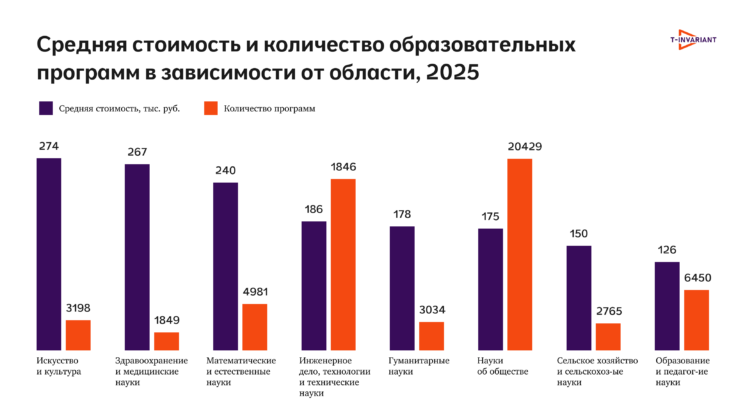 В числе самых дешёвых программ заметно выделяется теология — в некоторых региональных вузах её стоимость составляет 8–10 тысяч рублей в год.