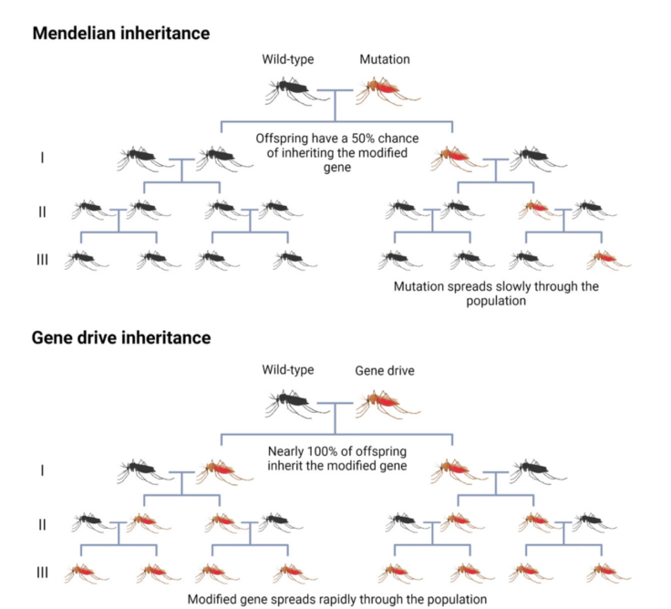 The essence of gene drive technology is to create a gene allele that will be passed from a modified individual to nearly all offspring — 99% or more — rather than the usual 50% in sexual reproduction. Thus, the changes persist in the population and spread through it over the course of several generations. The introduced gene can perform a specific function, for example, the individual may produce only male offspring. This makes sense for eradicating species of mosquitoes that carry malaria — that is, mosquitoes of the genus Anopheles, particularly Anopheles gambiae.
